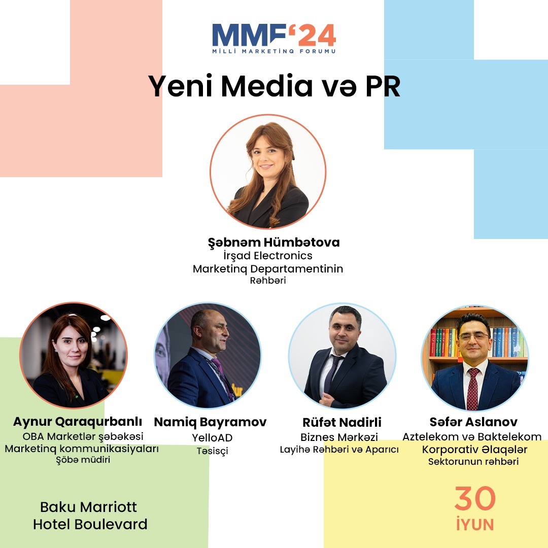 28 iyun online, 29, 30 iyun tarixlərində offline davam edəcək tədbirin üçüncü günü “Yeni media və PR” paneli ilə başlayacaq. “İrşad Electronics”in marketinq departamentinin rəhbəri Şəbnəm Hümbətovanın moderatorluğu ilə baş tutacaq paneldə “Biznes mərkəzi” verilişinin layihə rəhbəri və aparıcısı Rüfət Nadirli, “YelloAd” şirkətinin təsisçisi Namiq Bayramov, “OBA Marketlər Şəbəkəsi”nin marketinq kommunikasiyaları şöbə müdiri Aynur Qaraqurbanlı, “Aztelekom” və “Baktelekom”un korporativ əlaqələr sektorunun rəhbəri Səfər Aslanov öz təcrübələrini paylaşacaq.