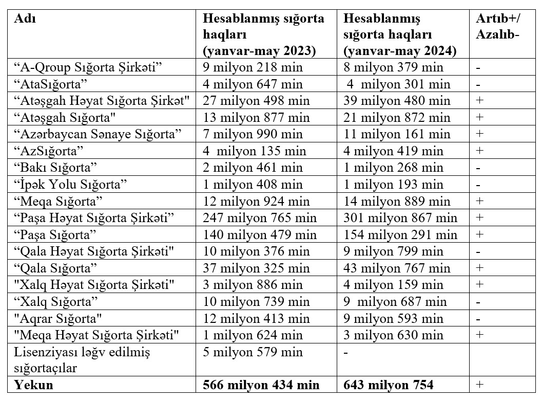 2024-cü ilin ilk 5 ayında (yanvar-may) hesablanan sığorta haqları Azərbaycanın 17 sığorta şirkətindən 10-nunda artıb, 7-sində azalıb.