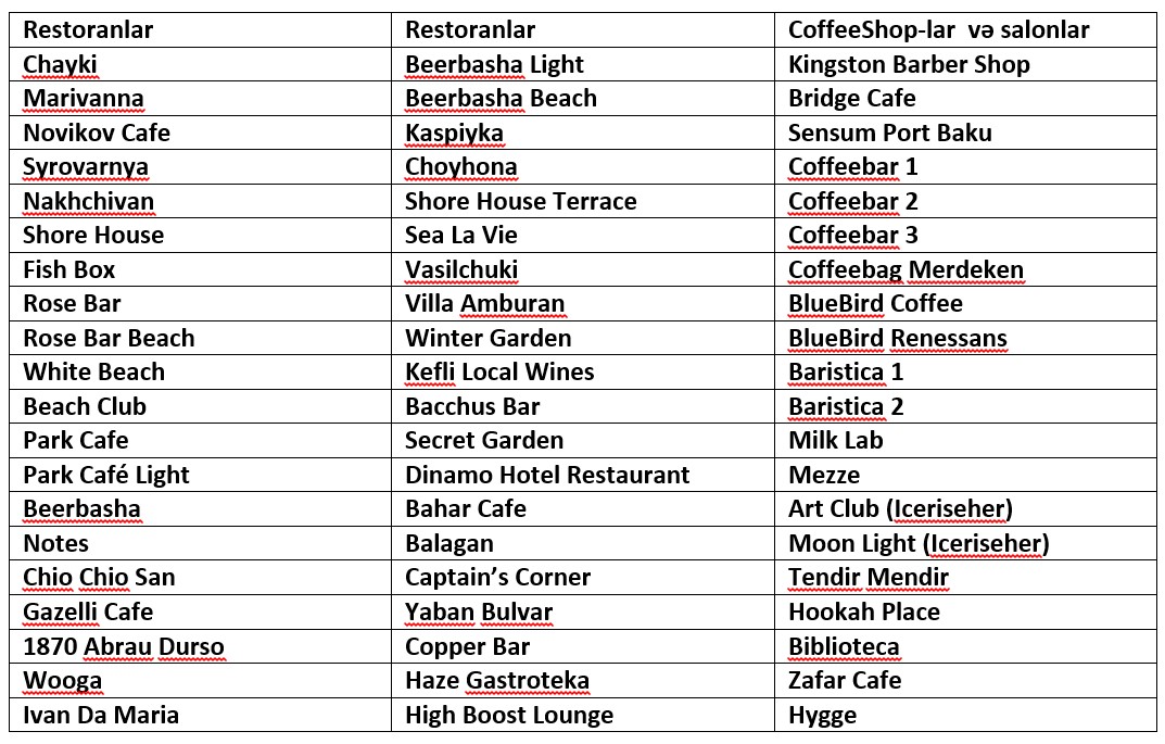 Xidmətin aktiv olduğu restoranlar aşağıdakılardır: