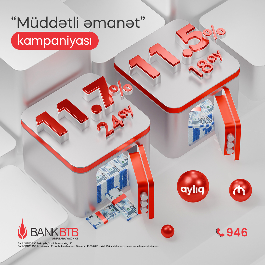 (®) Bank “BTB” ASC-də əmanət şərtləri yenilənərək sərfəli şərtlərlə “Müddətli əmanət” kampaniyasına start verib.