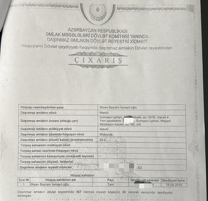 “Bu şəxsin 40 kvadratmetrlik əmlakı var, amma buna görə bizdən 250 min manat pul istəyir. Vətəndaş istəyir ki, bütün problemlərini bizim şirkətlə həll etsin. Biz onlara 140 min manat veririk. Sumqayıtda 140 minə 2 dənə 2 otaqlı ev almaq olar. Hətta idmançı olduğu üçün ona dedim ki, 140 mindən əlavə müalicəsinə də 10 min dollarlıq kömək edərəm. Mənə dedi ki, xəstəyəm ona görə bu addımı atdım. Razılaşmanın olmamasının səbəbi evin hər kvadratmetrinə görə 7 min manat istəməsidir.