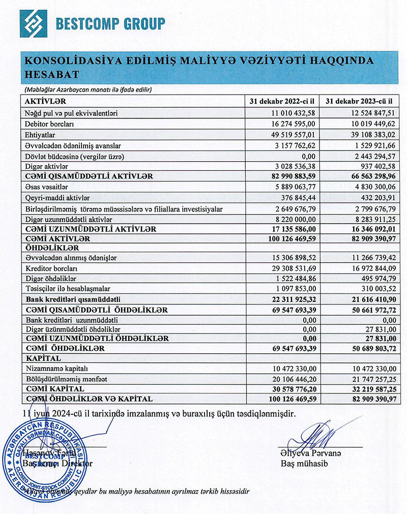31 dekabr 2023-ci il tarixində "Bestcomp Group" QSC 82 milyon 909 min manat cəmi aktivlərə malik olub. Şirkət 2022-ci ilin sonunda 100 milyon 126 min manat cəmi aktivlərə malik idi.