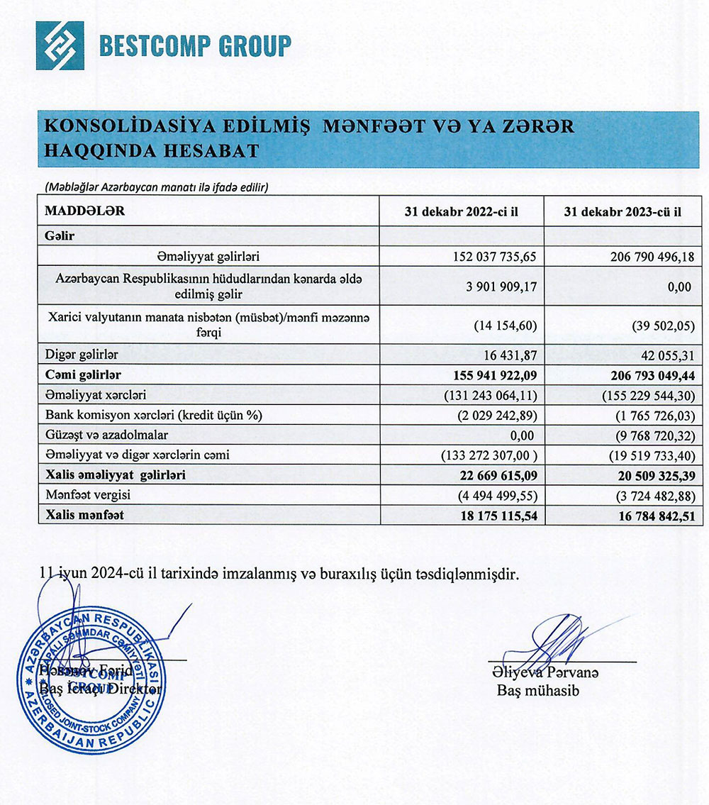 Ötən il "Bestcomp Group" 42 min manat digər gəlirlər də əldə edib (2022-ci ildə 16 min manat).