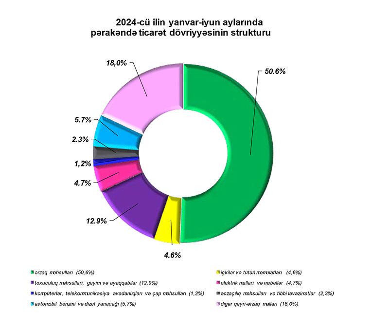 2024-cü ilin birinci yarısında alıcıların pərakəndə ticarət şəbəkəsində aldıqları mallara xərclədiyi vəsaitin 50,6 faizi ərzaq məhsullarının, 4,6 faizi içkilər və tütün məmulatlarının, 12,9 faizi toxuculuq məhsulları, geyim və ayaqqabıların, 5,7 faizi avtomobil benzini və dizel yanacağının, 4,7 faizi elektrik malları və mebellərin, 2,3 faizi əczaçılıq məhsulları və tibbi ləvazimatların, 1,2 faizi kompüterlər, telekommunikasiya avadanlıqları və çap məhsullarının, 18,0 faizi isə digər qeyri-ərzaq mallarının alınmasına sərf olunmuşdur.