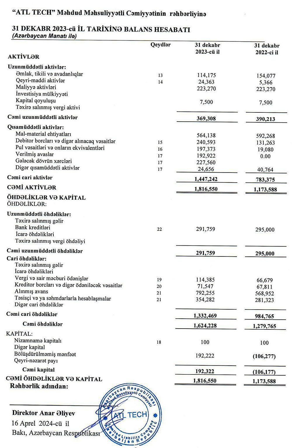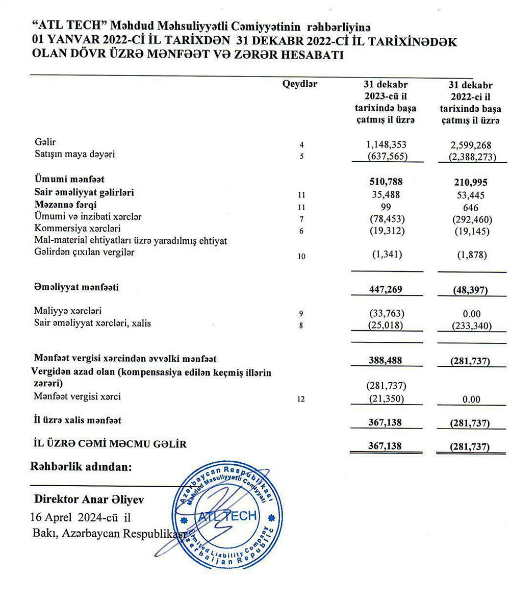Ötən il satışın maya dəyəri isə 1 milyon 751 min manat azalaraq 638 min manata düşüb (2022-c ildə 2 milyon 388 min manat). Satışın maya dəyərindəki azalma gəlirdəki azalmadan yüksək olduğuna görə, Şirkətin ümumi mənfəəti 2022-ci ildəki 211 min manata qarşı, ötən il 511 min manat təşkil edib. 2023-cü ildə "ATL Tech"in ümumi və inzibati xərcləri də 3,7 dəfə azalaraq 78 min manata düşüb (2022-ci ildə 292 min manat). Beləliklə, xərclərin azalması gəlirlərin azalmasından daha yüksək məbləğdə olduğu üçün "ATL Tech" ötən ili xalis mənfəət ilə başa vurub.