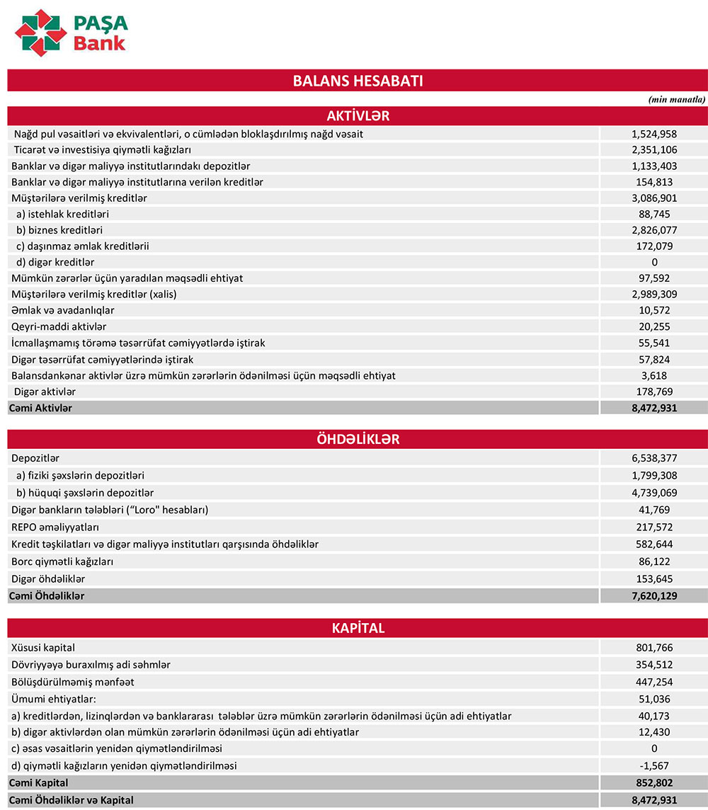 2024-cü ilin yanvar-iyun dövründə "PAŞA Bank"ın cəmi aktivləri 178 milyon 440 min manat və ya 2% azalaraq 8 milyard 472 milyon 931 min manata düşüb. Bankın kredit portfeli (müştərilərə verilmiş kreditlər) 251 milyon 458 min manat və ya 8,9% artaraq 3 milyard 86 milyon 901 min manata yüksəlib. O cümlədən, istehlak kreditləri portfeli 3 milyon 70 min manat artaraq 88 milyon 745 min manata, biznes kreditləri portfeli 231 milyon 753 min manat artaraq 2 milyard 826 milyon 77 min manata, ipoteka kreditləri portfeli 16 milyon 634 min manat artaraq 172 milyon 79 min manata çatıb.