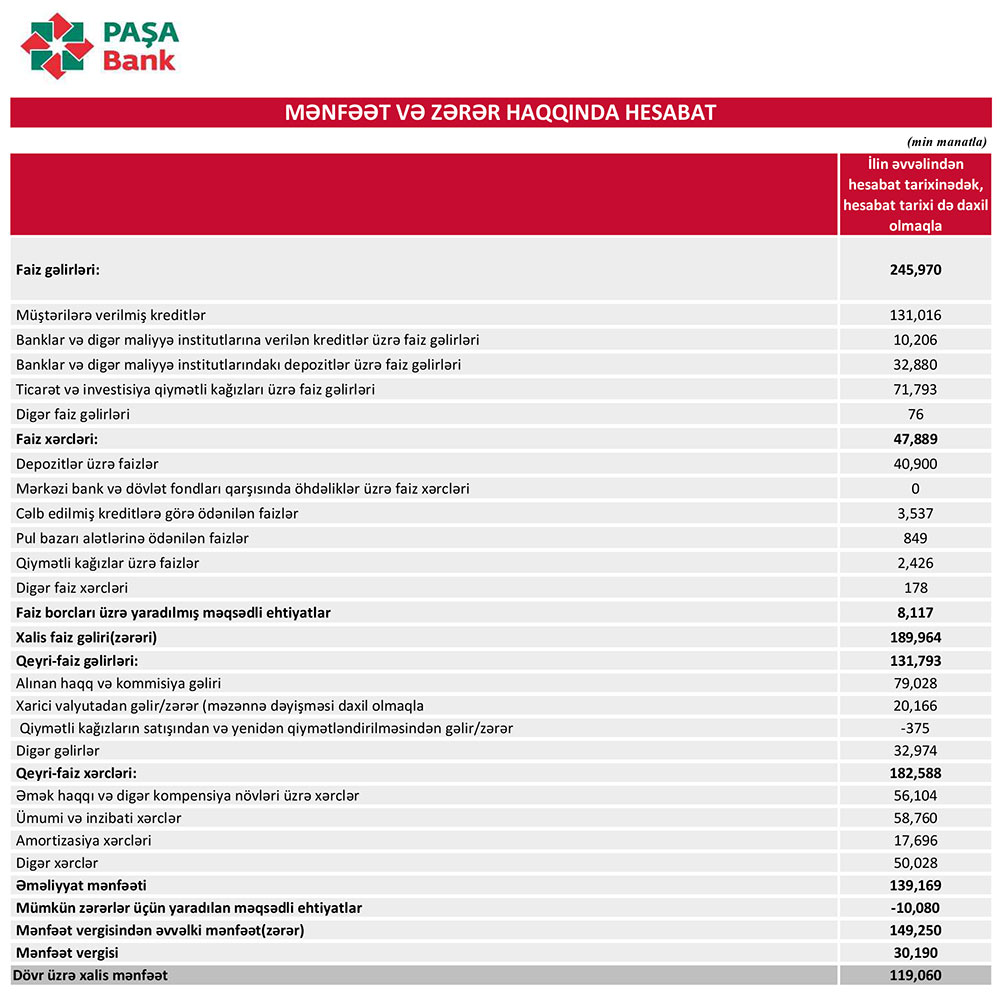 "PAŞA Bank" ASC 2024-cü ilin 1-ci yarısını (yanvar-iyun) 119 milyon 60 min manat xalis mənfəət ilə başa vurub. Bank ötən ilin eyni dövrünü 97 milyon 106 min manat xalis mənfəət ilə bağlamışdı. Beləliklə, "PAŞA Bank" ASC-nin xalis mənfəəti 2024-cü ilin ilk 6 ayında 2023-cü ilin eyni dövrü ilə müqayisədə 21 milyon 954 min manat və ya 22,6% artıb.