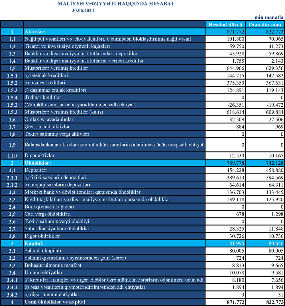 2024-cü ilin yanvar-iyun dövründə, ötən ilin sonu ilə müqayisədə “Turan Bank”ın cəmi aktivləri 48 milyon 999 min manat və ya 6% artaraq 871 milyon 772 min manata yüksəlib.