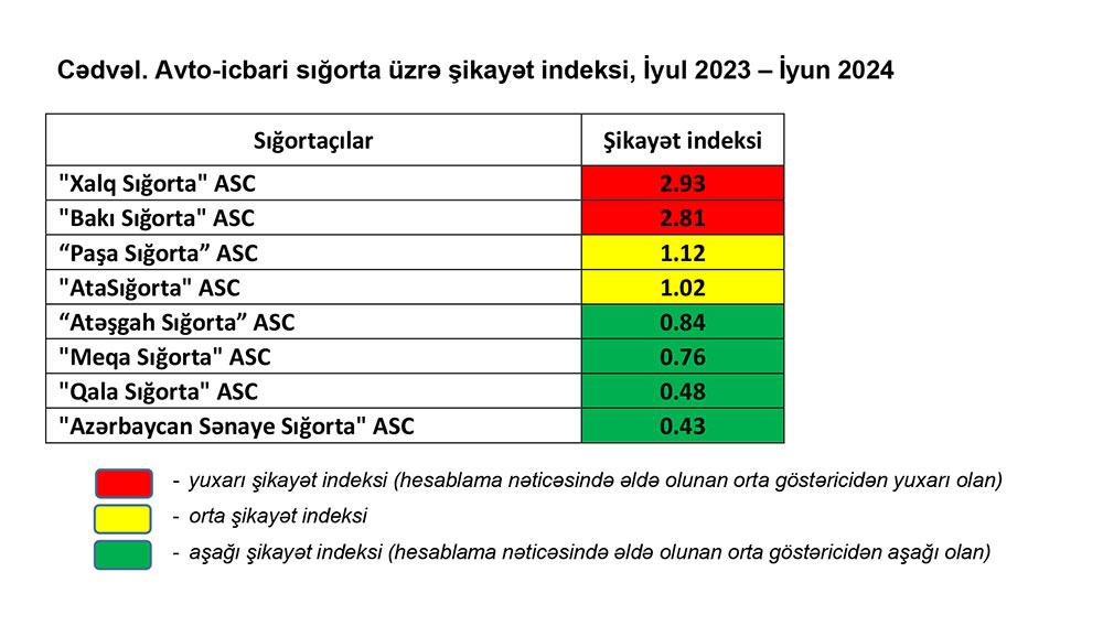 Marja.az İndeksə istinadən xəbər verir ki, yuxarı şikayət indeksində "Xalq Sığorta" ASC, "Bakı Sığorta" ASC, orta şikayət indeksində “Paşa Sığorta” ASC, "AtaSığorta" ASC, aşağı şikayət indeksində “Atəşgah Sığorta” ASC, "Meqa Sığorta" ASC, "Qala Sığorta", "Azərbaycan Sənaye Sığorta" ASC yer alıb.