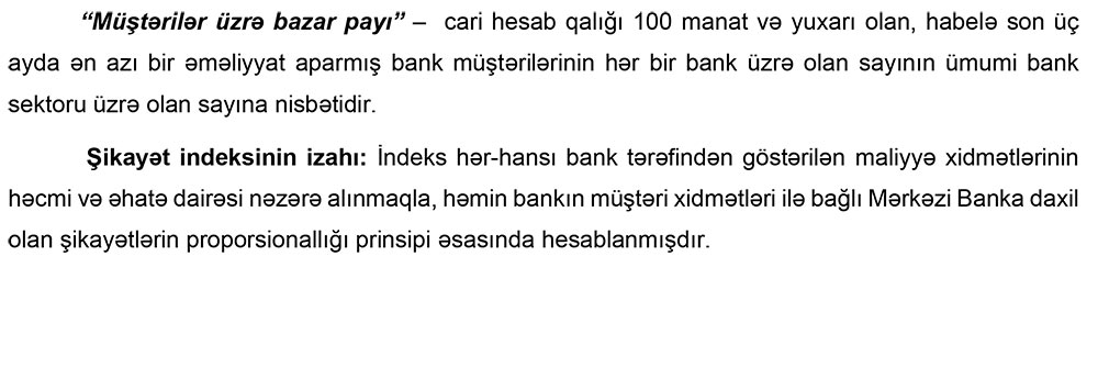 “Müştərilər üzrə bazar payı” – cari hesab qalığı 100 manat və yuxarı olan, habelə son üç ayda ən azı bir əməliyyat aparmış bank müştərilərinin hər bir bank üzrə olan sayının ümumi bank sektoru üzrə olan sayına nisbətidir.