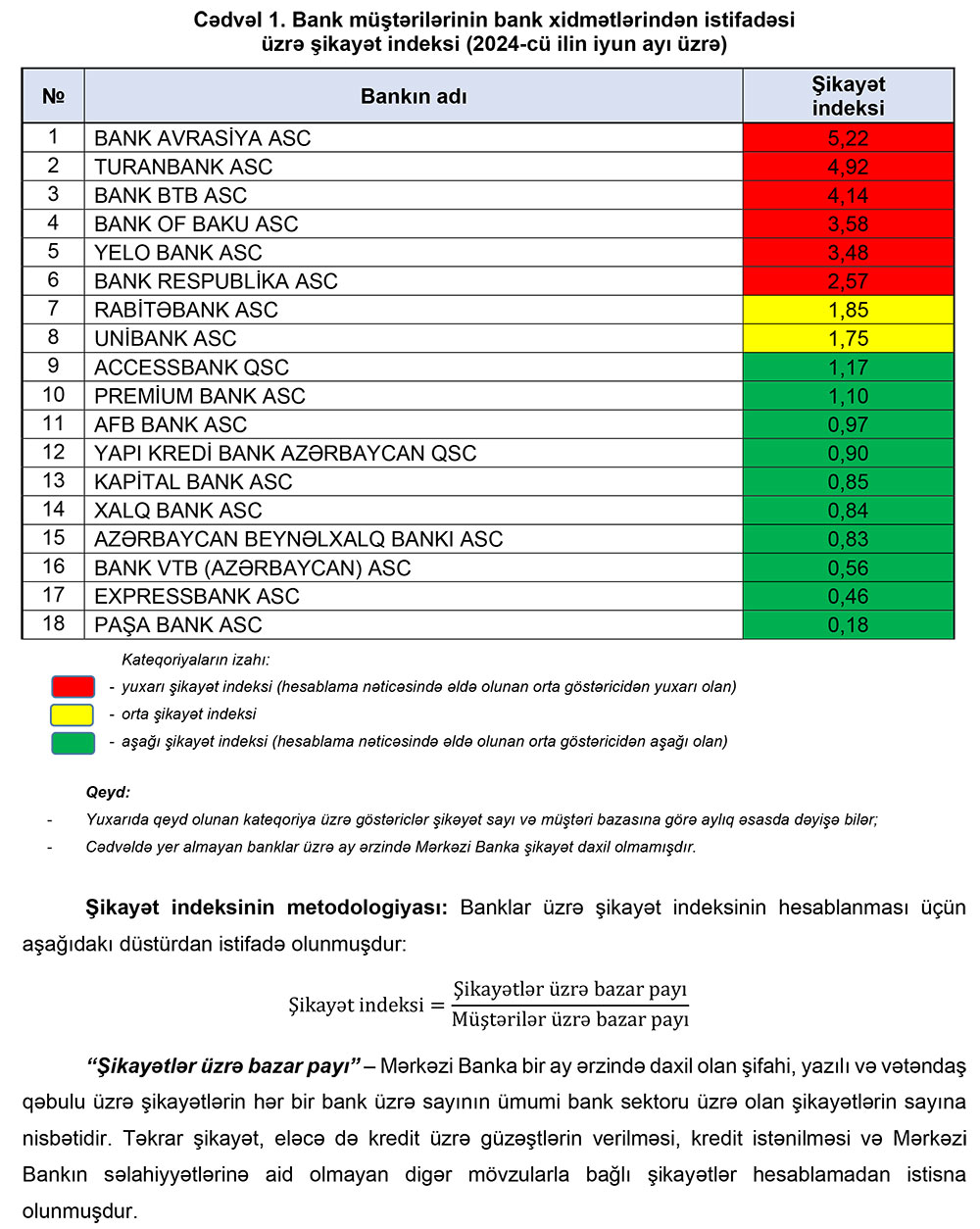 Şikayət indeksinin izahı: İndeks hər-hansı bank tərəfindən göstərilən maliyyə xidmətlərinin həcmi və əhatə dairəsi nəzərə alınmaqla, həmin bankın müştəri xidmətləri ilə bağlı Mərkəzi Banka daxil olan şikayətlərin proporsionallığı prinsipi əsasında hesablanmışdır