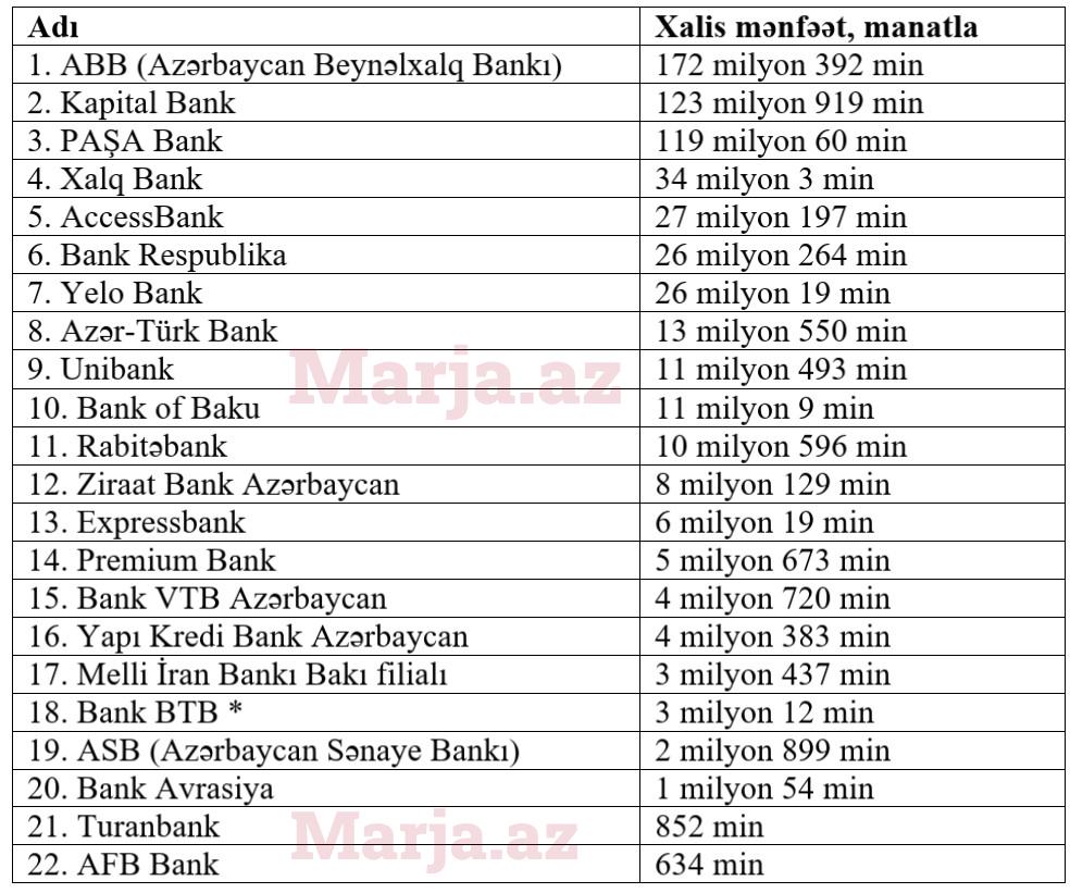 Aşağıdakı cədvəldə bankların adları və onların ilk yarımildə əldə etdiyi xalis mənfəətə görə siyahıdakı yeri göstərilib.