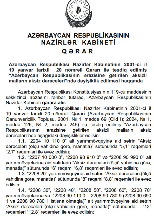 Nazirlər Kabineti 19 yanvar 2001-ci il tarixli qərarı ilə təsdiq edilmiş “Azərbaycan Respublikasının ərazisinə gətirilən aksizli malların aksiz dərəcələri”ndə dəyişiklik edib.