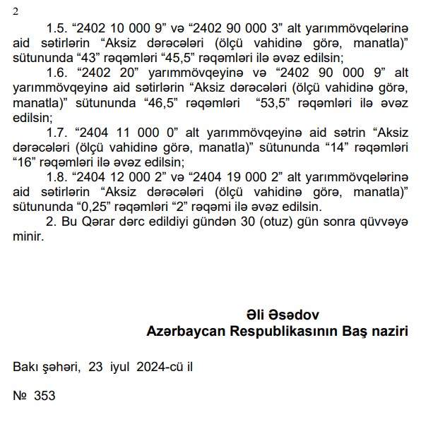 Qərara əsasən, Azərbaycana idxal edilən şampan şərabının hər litri üçün aksiz vergisi 5,1 manatdan 2,7 manata endirilib, denaturasiya olunmamış etil spirtinin (80 həcm faiz və ya çox spirt qatılığı ilə) və həcm faizi 80-dən az qatılığı olan denaturatlaşdırılmamış etil spirtinin hər litri üçün aksiz vergisi 6 manatdan 6,8 manata qaldırılıb, üzüm çaxırının və ya üzüm puçallarının distillə edilməsi nəticəsində alınan spirtli tinkturaların hər litri üçün aksiz vergisi 8 manatdan 8,8 manata, viski, rom və digər spirtli tinkturalar, şəkər qamışının qıcqırdılmış məhsullarının qovulması nəticəsində alınan cin və ardıc tinkturası, araq, likörlər və digər spirtli içkilərin hər litri üçün aksiz vergisi 12 manatdan 12,8 manata qaldırılıb.