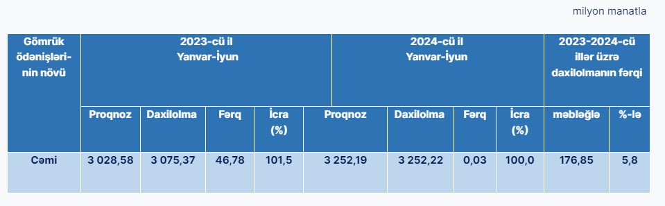 Marja.az Komitəyə istinadən xəbər verir ki, Azərbaycan Respublikasının 2024-cü ilin dürüstləşdirilmiş dövlət büdcəsinə əsasən 2024-cü ilin 6 (altı) ayı üzrə Dövlət Gömrük Komitəsi üçün müəyyənləşdirilən 3 milyard 252,19 milyon manat proqnoza qarşı 3 milyard 252,22 milyon manat gömrük ödənişlərinin toplanaraq dövlət büdcəsinə köçürülməsi təmin olunmuş və büdcə öhdəliyi 100 faiz icra olunmuşdur.