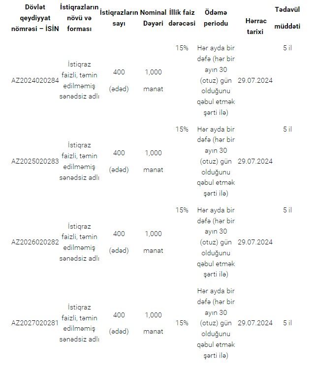 İstiqrazların cəmi həcmi 1,6 milyon manat, illik gəlirlilik faizi 15%, tədavül müddəti 5 ildir