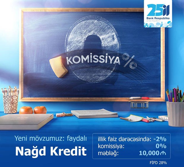 Tәhsil haqqı ödәnişi vә ya mәktәb lәvazimatlarının alışını indi komissiyasız vә illik faiz dәrәcәsinә 2% endirimlә tәklif olunan nağd kredit vasitәsilә ödәmәk mümkündür.