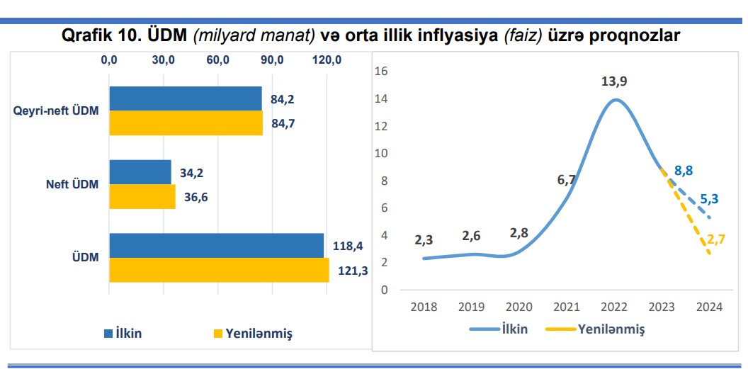 Qeyd edilib ki, 2024-cü ilin dövlət büdcəsinin layihəsi baxılan zamanı (2023-cü ilin oktyabr ayı) İqtisadiyyat Nazirliyi tərəfindən təqdim edilmiş proqnozlara əsasən ÜDM 118,4 milyard manat, qeyri-neft/qaz ÜDM 84,2 milyard manat, real artım tempi isə müvafiq olaraq 2,4 və 4,6 faiz səviyyəsində götürülmüşdür.