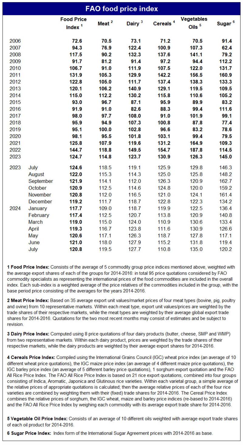 FAO-nun Ərzaq Qiymətləri İndeksinə görə, qlobal ərzaq qiymətləri iyul ayında iyun ayı ilə müqayisədə 0,2 faiz, 2023-cü ilin iyul ayı ilə müqayisədə isə 3 faiz azalıb.İyul ayında qlobal ərzaq qiymətlərində, cüzi də olsa, azalma davam edib.