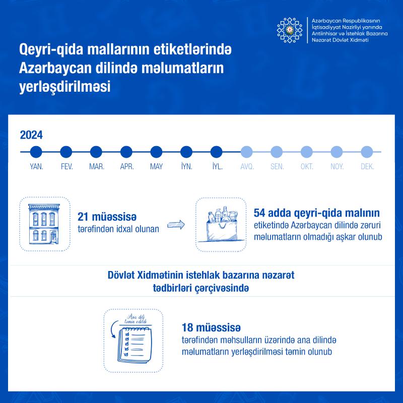 2024-cü ilin 7 ayı ərzində DAntiinhisar və İstehlak Bazarına Nəzarət Dövlət Xidmətinin istehlak bazarına nəzarət tədbirləri çərçivəsində 21 müəssisə tərəfindən idxal olunan 54 adda qeyri-qida malının etiketində Azərbaycan dilində zəruri məlumatların olmadığı aşkar olunub.