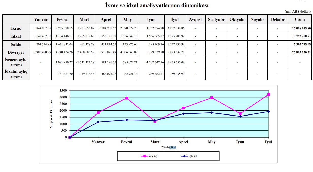 Xarici ticarətin müsbət saldosu 5 milyard 915 milyon dollar və ya 52,7% azalıb. Səbəb ixracın azalması, idxalın isə artmasıdır.2024-cü ilin 7 ayı ərzində (yanvar-iyul) Azərbaycanın xarici ticarәt әmәliyyatlarının hәcmi 26 milyard 892 milyon 121 min ABŞ dolları təşkil edib.