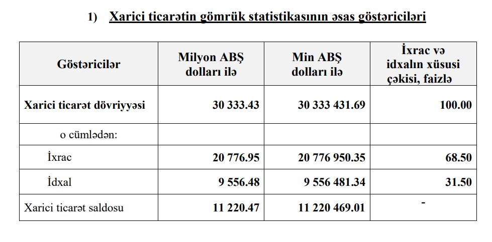 Qeyd edək ki, 2023-cü ilin 7 ayı ərzində (yanvar-iyul) Azərbaycanın xarici ticarәt әmәliyyatlarının hәcmi 30 milyard 333 milyon 432 min ABŞ dolları, o cümlədən ixrac 20 milyard 776 milyon 950 min ABŞ dolları, idxal 9 milyard 556 milyon 481min ABŞ dolları, müsbət saldo 11 milyard 220 milyon 469 min ABŞ dolları təşkil etmişdi.