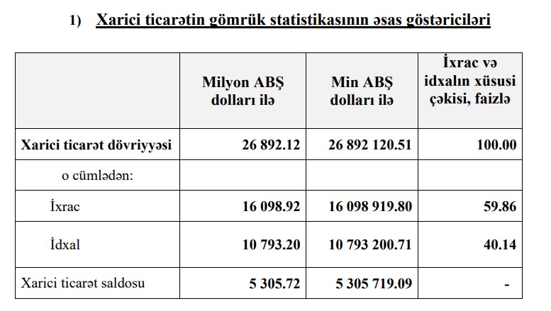 Marja.az Dövlət Gömrük Komitəsinə istinadən xəbər verir ki, o cümlәdәn, ixrac әmәliyyatları üzrә 16 milyard 98 milyon 920 min ABŞ dolları, idxal әmәliyyatları üzrә 10 milyard 793 milyon 201 min ABŞ dolları məbləğində ticarət qeyd alınıb. Əməliyyatlar 5 milyard 305 milyon 719 milyon ABŞ dolları məbləğində müsbət saldo ilə nəticələnib.