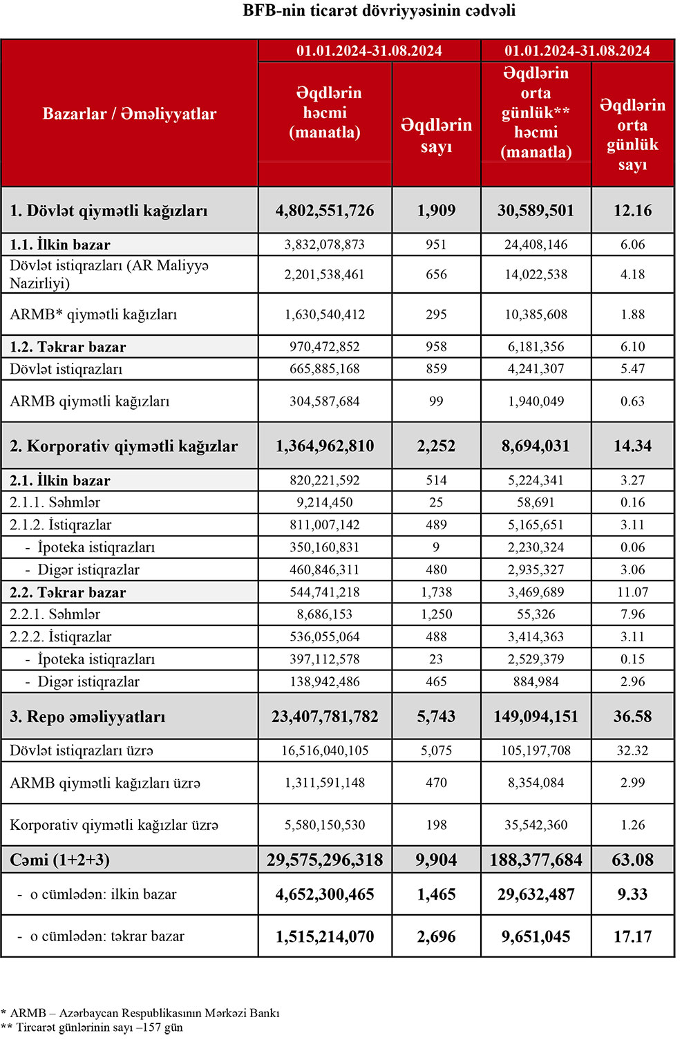 Qeyd edilib ki, ötən ilin müvafiq dövrü ilə müqayisədə 2024-cü ilin yanvar-avqust ayları ərzində korporativ qiymətli kağızaların ticarət həcmində 52%, dövlət qiymətli kağızların ilkin bazardakı ticarət həcmində isə 28%, repo əməliyyatları üzrə 241% artım olmuşdur.