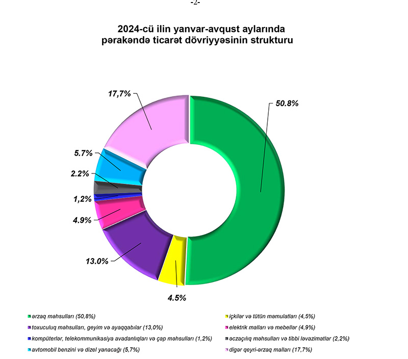 2024-cü ilin yanvar-avqust aylarında alıcıların pərakəndə ticarət şəbəkəsində aldıqları mallara xərclədiyi vəsaitin 50,8 faizi ərzaq məhsullarının, 4,5 faizi içkilər və tütün məmulatlarının, 13,0 faizi toxuculuq məhsulları, geyim və ayaqqabıların, 5,7 faizi avtomobil benzini və dizel yanacağının, 4,9 faizi elektrik malları və mebellərin, 2,2 faizi əczaçılıq məhsulları və tibbi ləvazimatların, 1,2 faizi kompüterlər, telekommunikasiya avadanlıqları və çap məhsullarının, 17,7 faizi isə digər qeyri-ərzaq mallarının alınmasına sərf olunmuşdur.