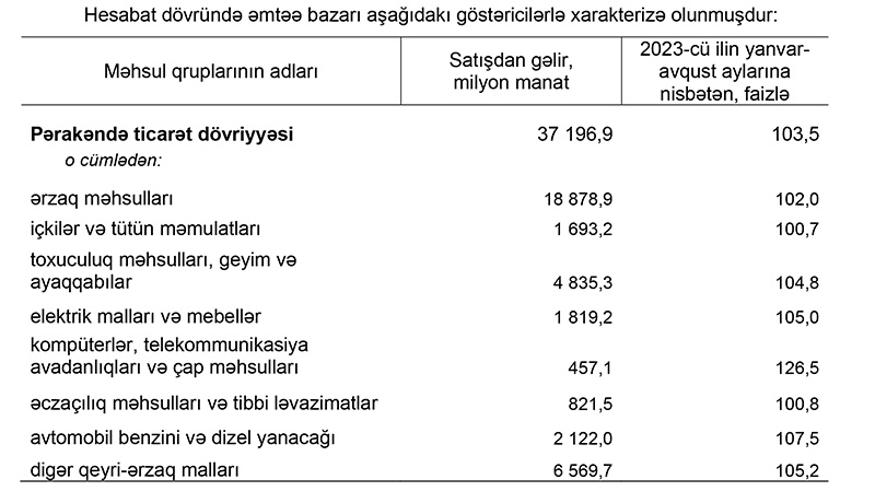 2023-cü ilin yanvar-avqust ayları ilə müqayisədə pərakəndə ticarət dövriyyəsi real ifadədə 3,5 faiz, o cümlədən ərzaq məhsulları, içkilər və tütün məmulatları üzrə 1,9 faiz, qeyri-ərzaq malları üzrə 5,5 faiz artmışdır.