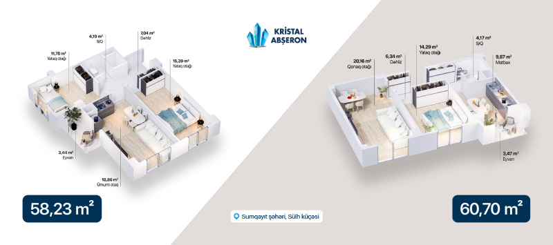 Kristal Abşerona məxsus bu yeni yaşayış kompleksi hər ailə və fərd üçün uyğun seçimlər təqdim edir. Layihədə 1, 2 və 3 otaqlı mənzillərlə yanaşı, kiçik ailələr üçün ideal planlanmış studiya tipli mənzillər də mövcuddur.