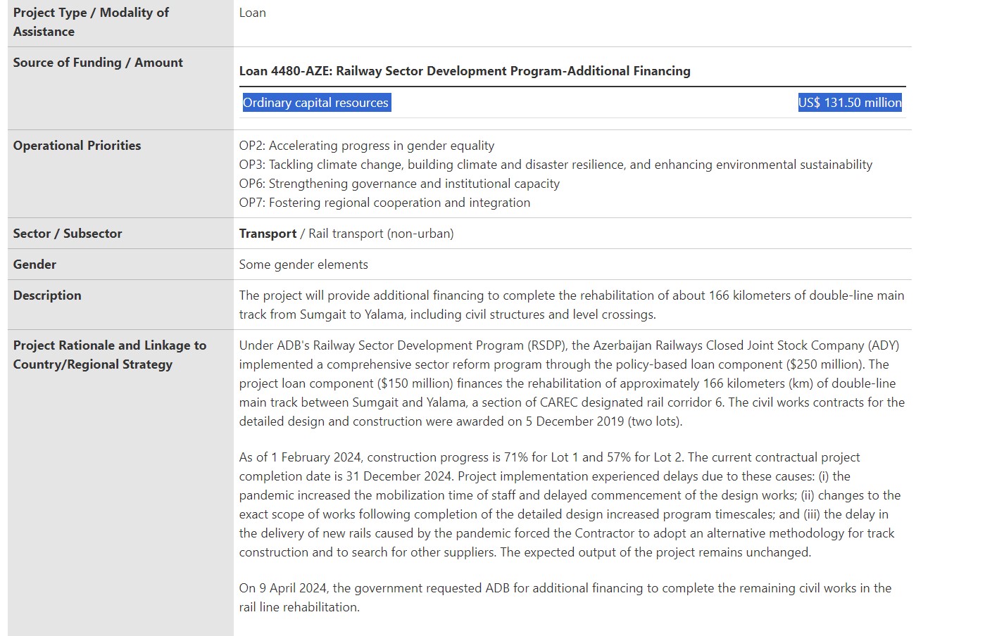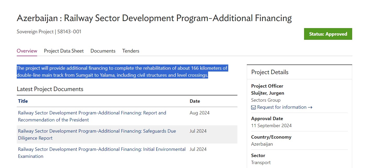 Vəsait Sumqayıt-Yalama hissəsində mülki tikililər və dəmir yolu keçidləri də daxil olmaqla 166 kilometrlik ikixətli magistralın bərpasının tamamlanmasına yönəldiləcək. Bu kredit ölkədə dəmir yolu əməliyyatlarının modernləşdirilməsinə yönəlmiş və 2017-ci ildə təsdiqlənmiş Dəmir Yolu Sektorunun İnkişafı Proqramına əlavə maliyyələşdirmədir.