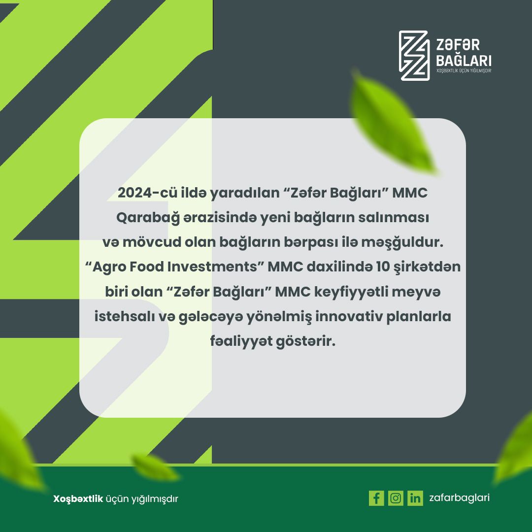 2024-cü ildə yaradılan "Zəfər Bağları" MMC Qarabağ ərazisində yeni bağların salınması və mövcud olan bağların bərpası ilə məşğuldur.