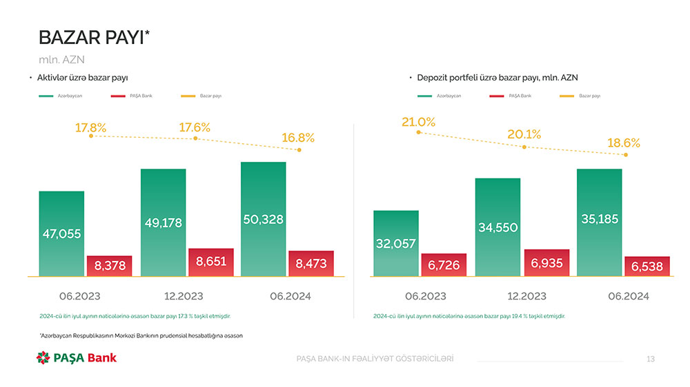 30 İyun 2024-cü il tarixində "PAŞA Bank"ın aktivlər üzrə bazar pay 16.8%, depozit portfeli üzrə bazar pay 18.6%, müştərilərə verilən kreditlər üzrə bazar payı 12.1% təşkil edib. 30 İyun 2023-cü il tarixində "PAŞA Bank"ın bazar payları müvafiq olaraq 17.8%, 21% və 12.9% təşkil etmişdi. Beləliklə, Bankın bazar payları aktivlər üzrə 1 faiz bəndi, depozit portfeli üzrə 2,4 faiz bəndi, müştərilərə verilən kreditlər üzrə isə 0,8 faiz bəndi azalıb.
