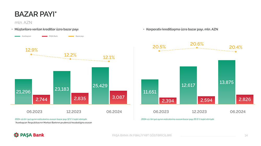 2024-cü ilin İyun ayının nəticələrinə əsasən, "PAŞA Bank" ASC-nin korporativ kreditləşmə üzrə bazar payı 20.4% təşkil edib.