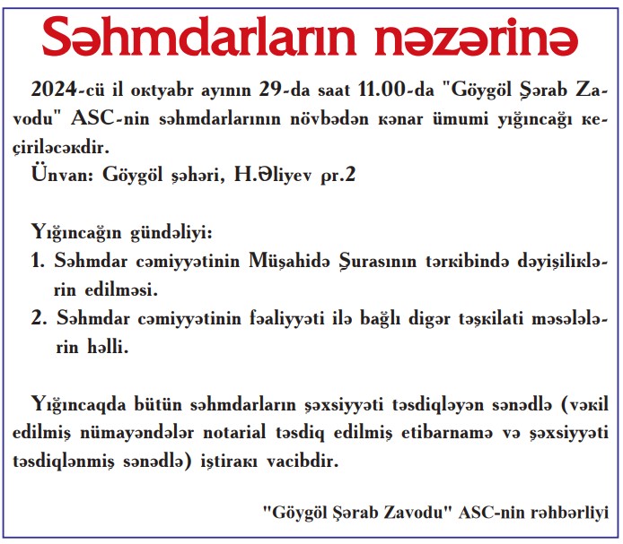 29 Oktyabr 2024-cü il tarixində "XAN" brendi ilə tanınan "Göygöl Şərab Zavodu" ASC-nin səjmdarlarının növbədənkənar yığıncağı keçiriləcəkdir.