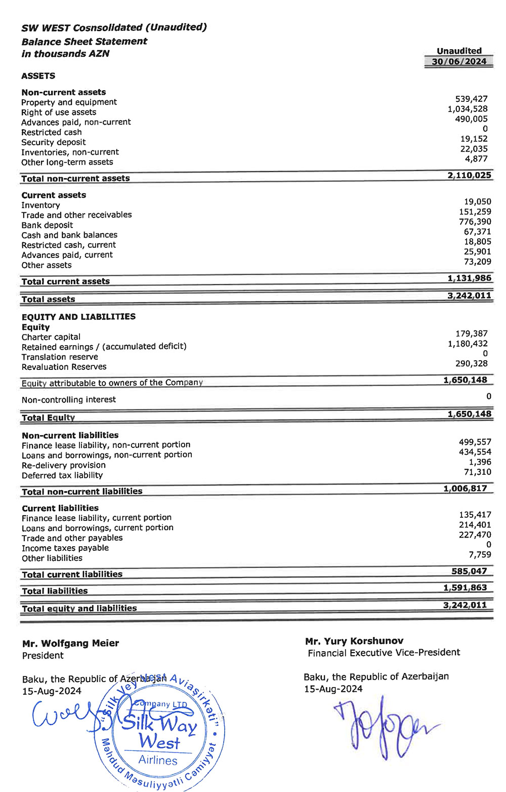 30 İyun 2024-cü il tarixində "Silk Vey Vest Aviaşirkəti" MMC 3 milyard 242 milyon 11 min manat cəmi aktivlərə malik olub. Şirkət 30 İyun 2023-cü il tarixində 2 milyard 612 milyon 837 min manat cəmi aktivlərə malik idi.