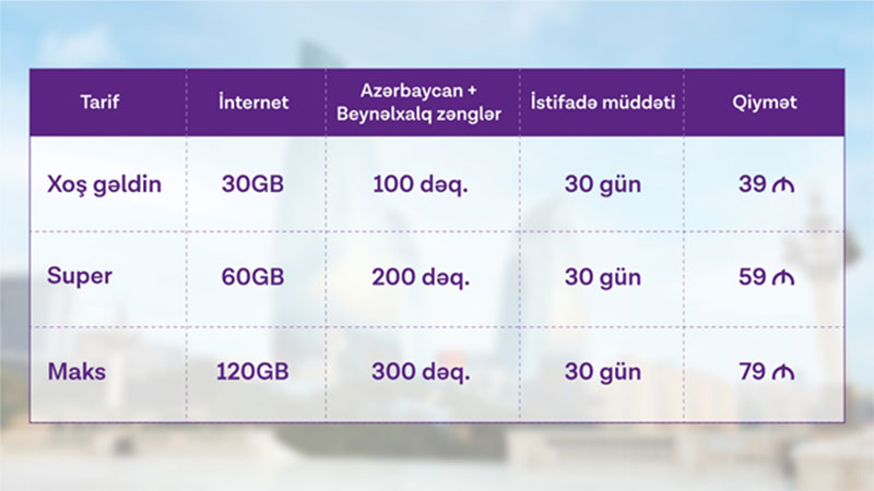 İndi “Xoş gəldin” tarifinin istifadəçiləri ay ərzində 30 GB internet, “Super” tarifinin istifadəçiləri 60 GB internet və “Maks” tarifinin istifadəçiləri 120 GB internet həcmindən yararlana bilərlər.
