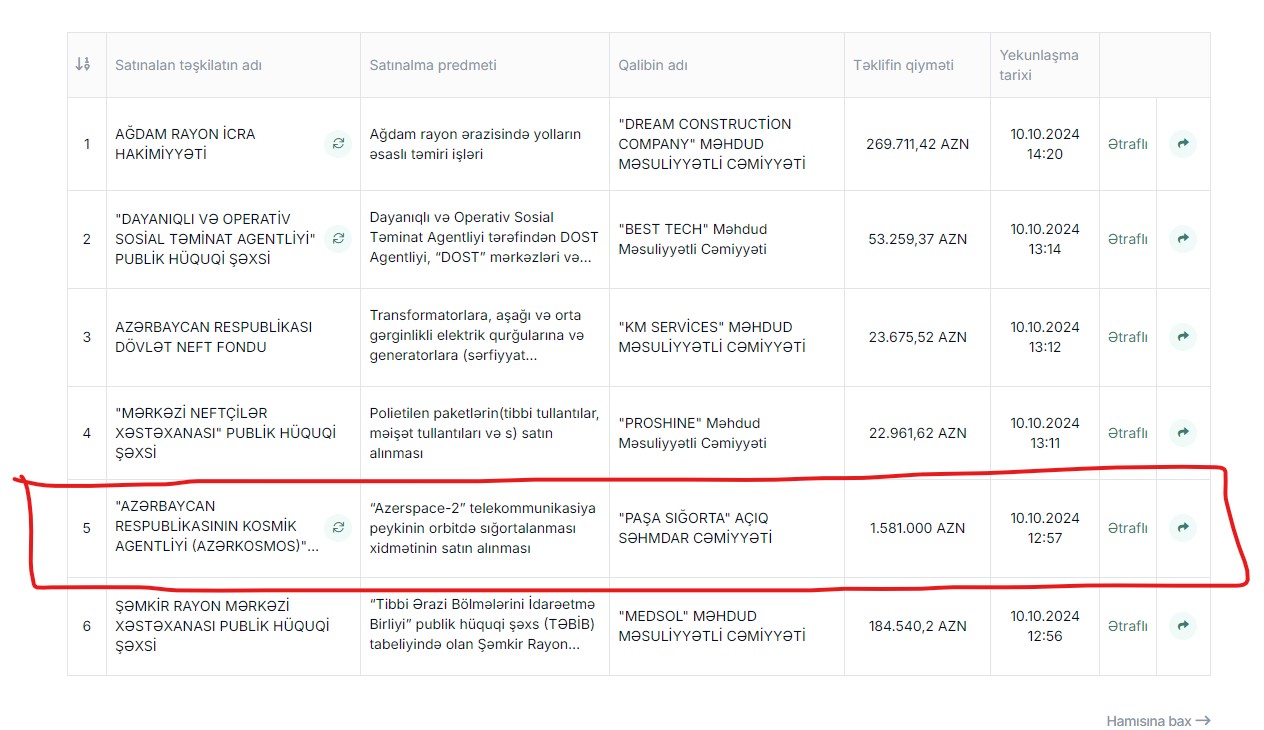 Rəqəmsal İnkişaf və Nəqliyyat Nazirliyi yanında Kosmik Agentlik ("Azərkosmos") dəyəri 81 milyon ABŞ dolları olan “Azerspace-2” telekommunikasiya peykinin sığortalanması üçün elan etdiyi açıq tenderə yekun vurub.