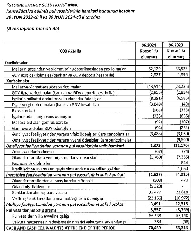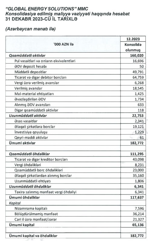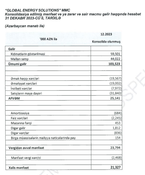 "Global Energy Solutions" MMC 2023-cü ildə 103 milyon 523 min manat cəmi gəlir, 21 milyon 327 min manat xalis mənfəət əldə etmişdi.