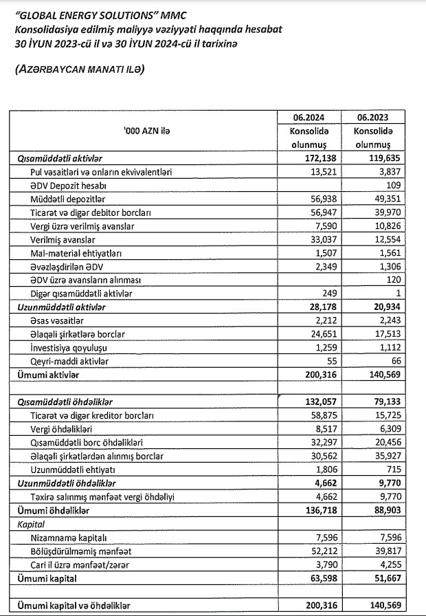 30 İyun 2024-cü il tarixində "Global Energy Solutions" MMC 200 milyon 316 min manat cəmi aktivlərə malik olub. Şirkət 30 İyun 2023-cü il tarixində 140 milyon 569 min manat cəmi aktivlərə malik idi.