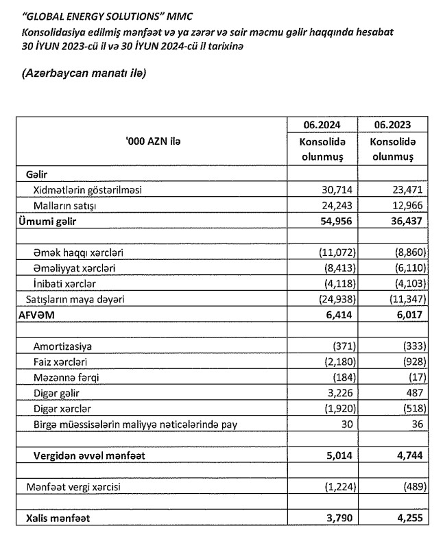Marja.az Şirkətin konsolidasiya edilmiş maliyyə hesabatına istinadən xəbər verir ki, "Global Energy Solutions" şirkətinin cəmi gəlirləri 2023-cü ilin ilk 6 ayı ilə müqayisədə 2024-cü ilin ilk 6 ayında 18 milyon 519 min manat və ya 50,8% artaraq 54 milyon 956 min manat təşkil edib.