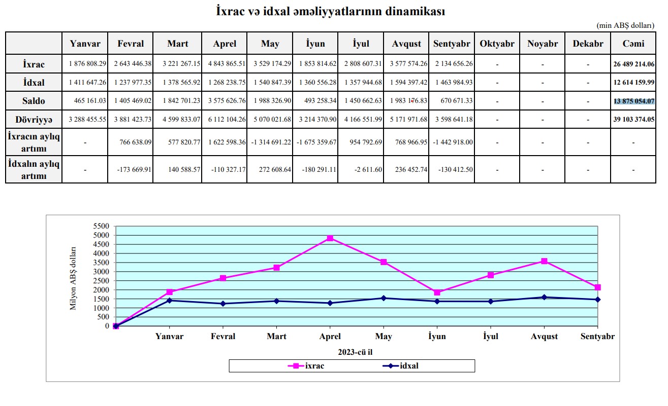 2024-cü ilin sentyabr ayında Azərbaycanın ixracı 1 milyard 623 milyon 153 min dollar, idxalı 1 milyard 879 milyon 17 idxal min dollar, saldo mənfi 255 milyon 863 min dollar təşkil edib.