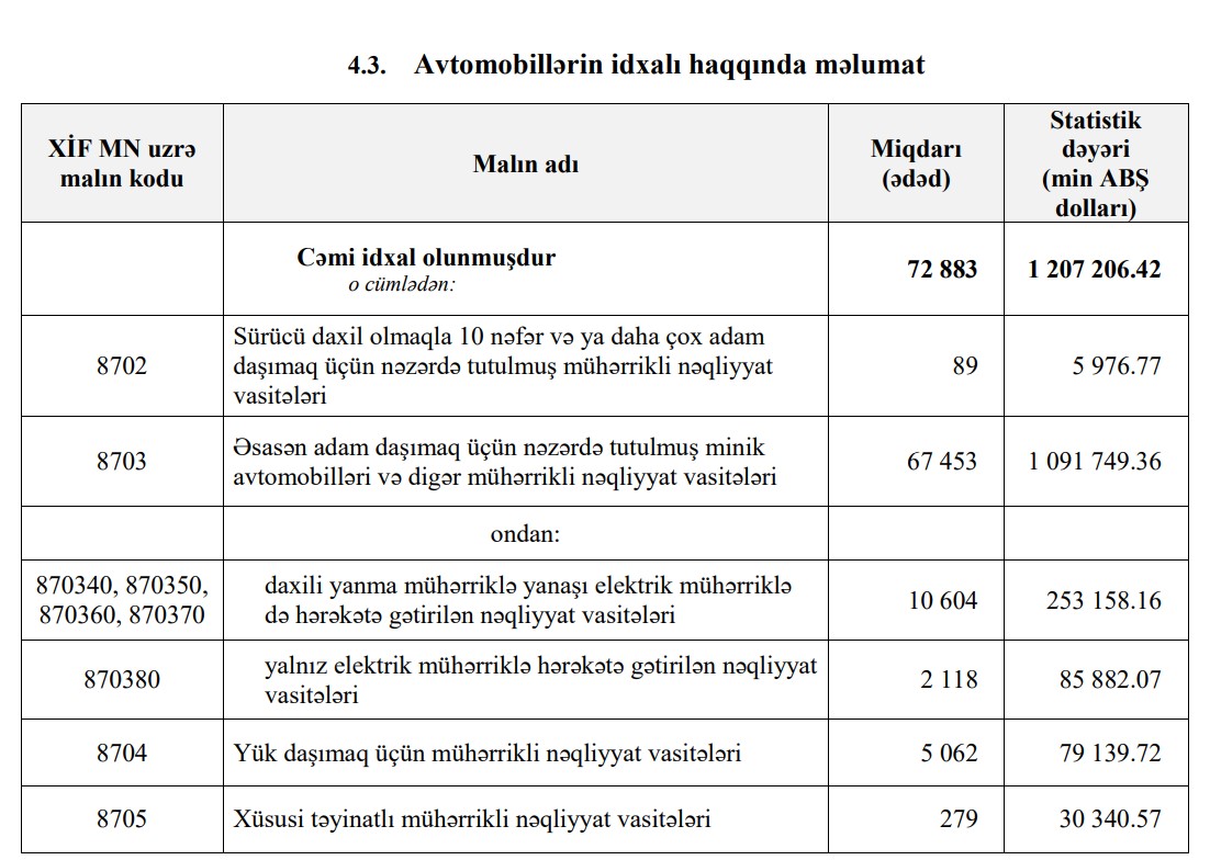 Azərbaycana hibrid, elektrik, yük avtomobillərinin və xüsusi texnikaların idxalı isə artıb.