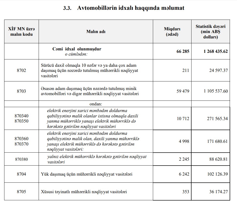 2024-cü ilin 9 ayı ərzində (yanvar-sentyabr) Azərbaycana 1 milyard 268 milyon 436 min ABŞ Dolları dəyərində 66 min 285 ədəd nəqliyyat vasitələri (avtomobillər) idxal olunub.