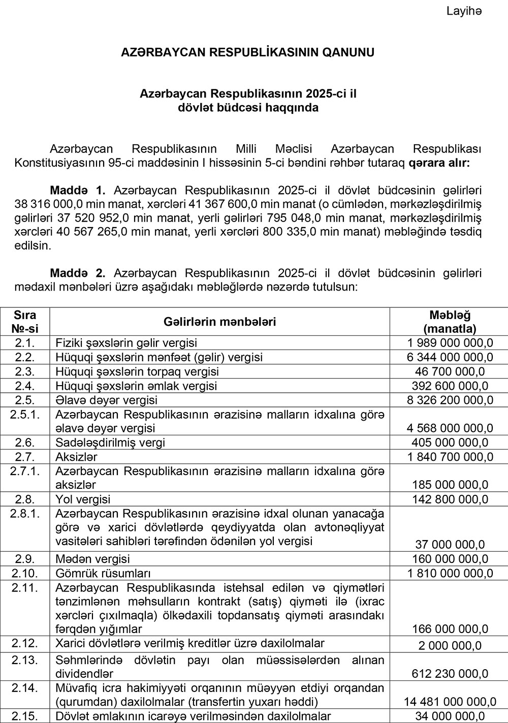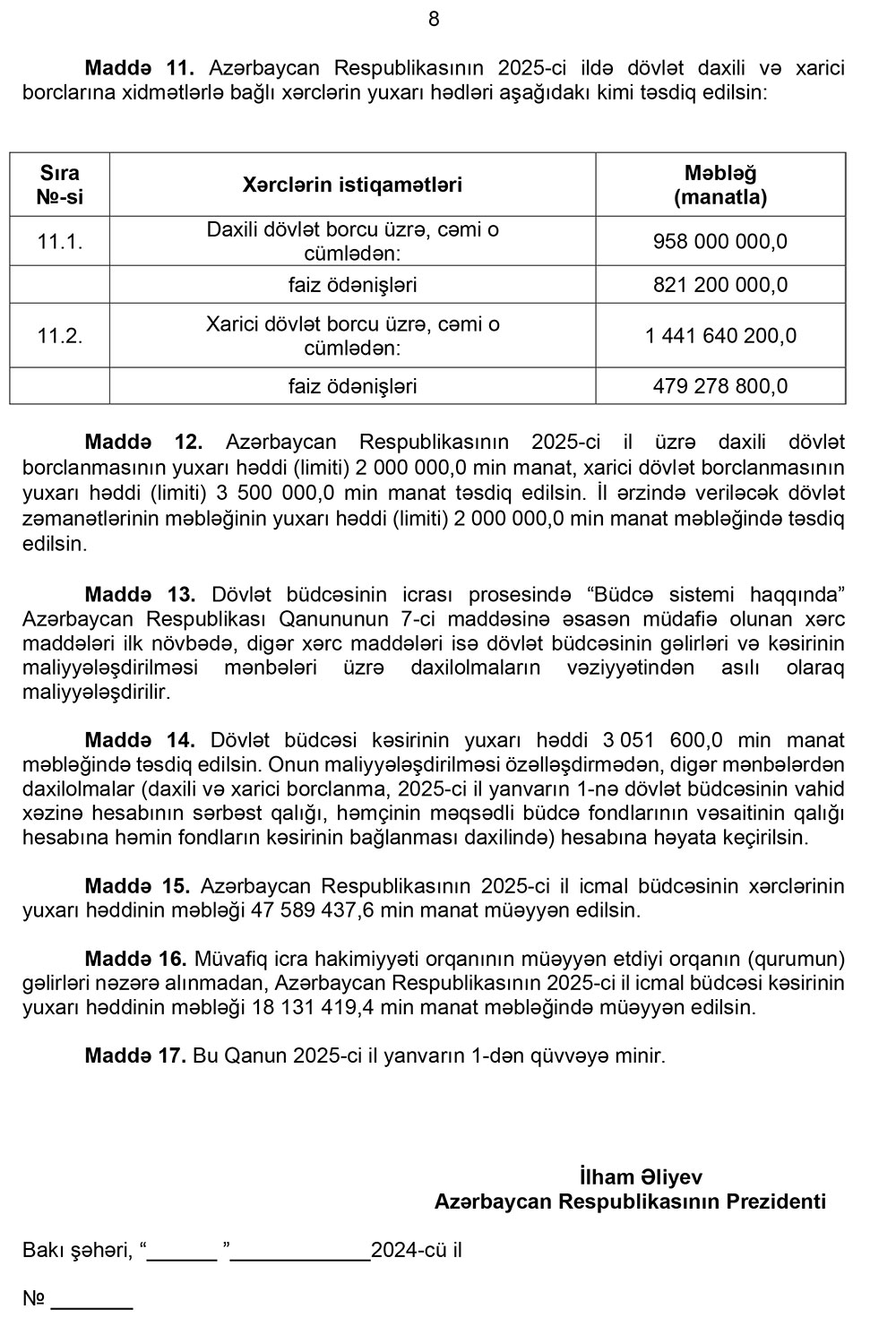 Oktyabrın 15-də Azərbaycan Respublikasının Prezidenti İlham Əliyev “Azərbaycan Respublikasının 2025-ci il dövlət büdcəsi haqqında” Qanun layihəsini Azərbaycan Respublikasının Milli Məclisin müzakirəsinə təqdim edilib.