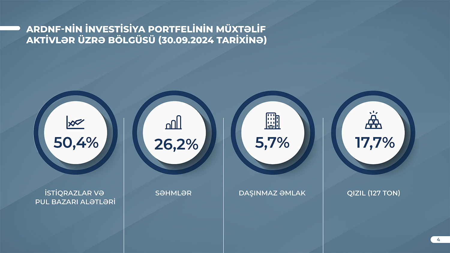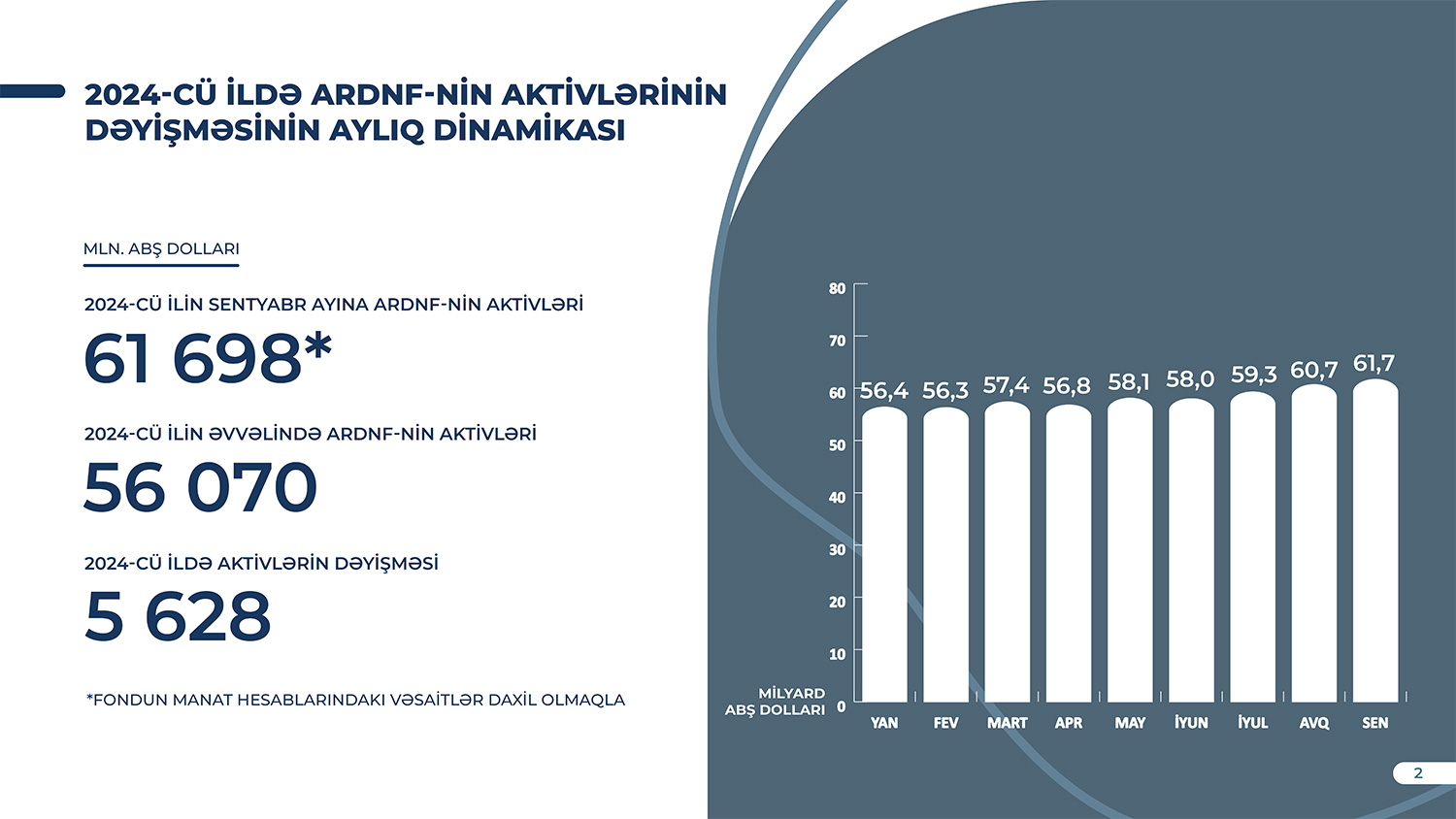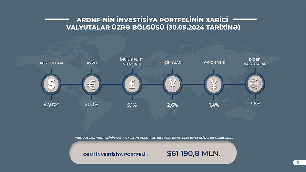 Azərbaycan Respublikası Dövlət Neft Fondu (ARDNF) bildirir ki, 2024-cü il sentyabr ayının 30-na ARDNF-nin aktivləri 2024-cü ilin əvvəlinə (56 milyard 69,7 milyon ABŞ dolları) nisbətən 10% və ya 5 milyard 628 milyon ABŞ dolları artaraq 61 milyard 697,6 milyon ABŞ dolları təşkil etmişdir.