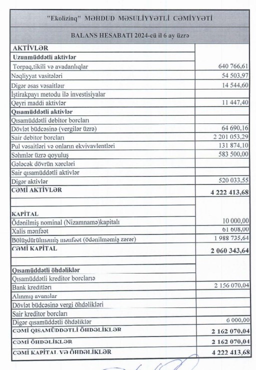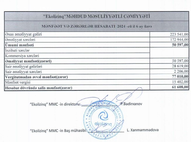 2024-cü ilin 6 ayı ərzində isə "Ekolizinq" MMC-nin cəmi gəlirləri 252 min 160 manat, xalis mənfəəti 61 min 608 manat olub.