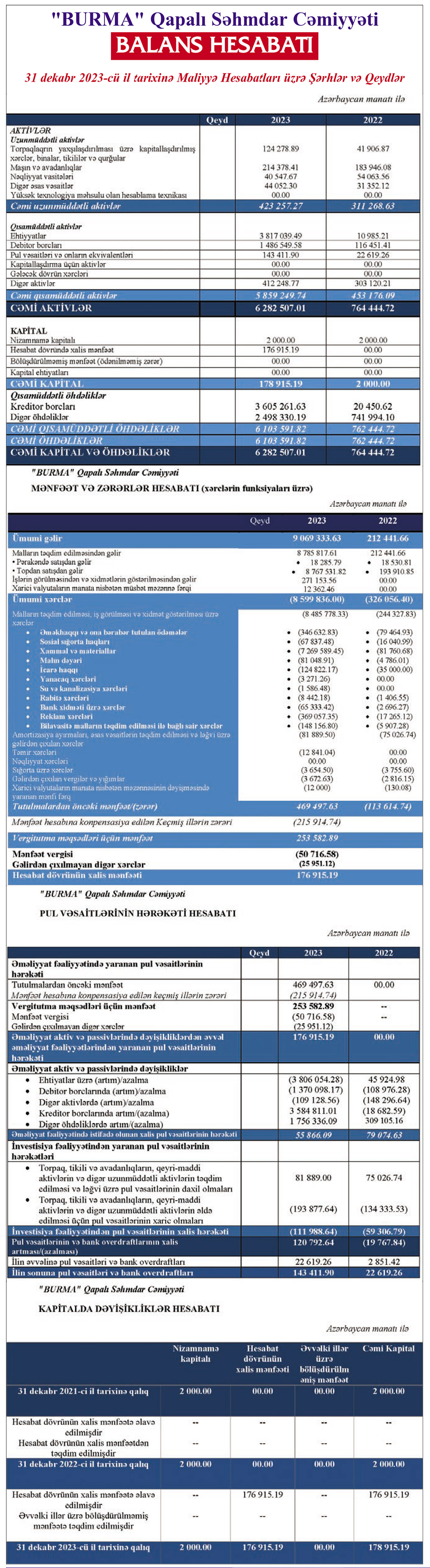 31 dekabr 2023-cü il tarixində "Burma" QSC 6 milyon 283 min manat cəmi aktivlərə malik olub. Şirkət 2022-ci ilin sonunda 764 min manat cəmi aktivlərə malik idi. Ötən il "Burma" QSC-nin cəmi aktivləri 8 dəfədən çox artıb.