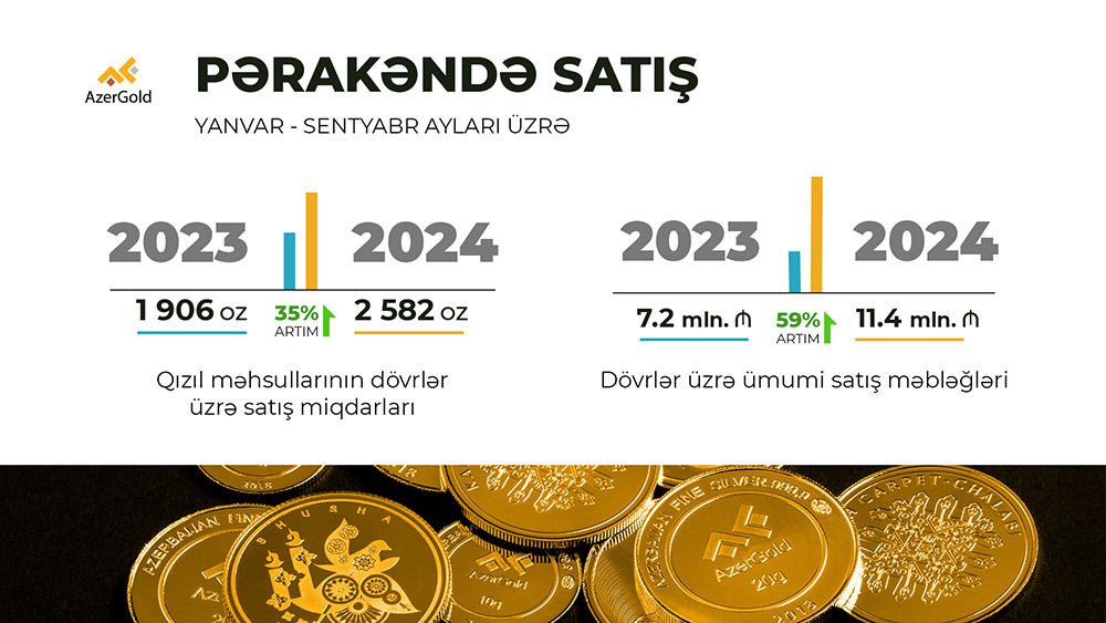 Qeyd edilib ki, “AzerGold” QSC yerli qızıl və gümüş xammalından istehsal etdiyi sikkə və külçələri ilk dəfə 2019-cu ildə satışa təqdim edib. Bu günə qədər 11 677 unsiya qızıl sikkə və külçə, 595 unsiya gümüş sikkənin pərakəndə satışı nəticəsində 44.2 milyon manat məbləğində gəlir əldə edilib.